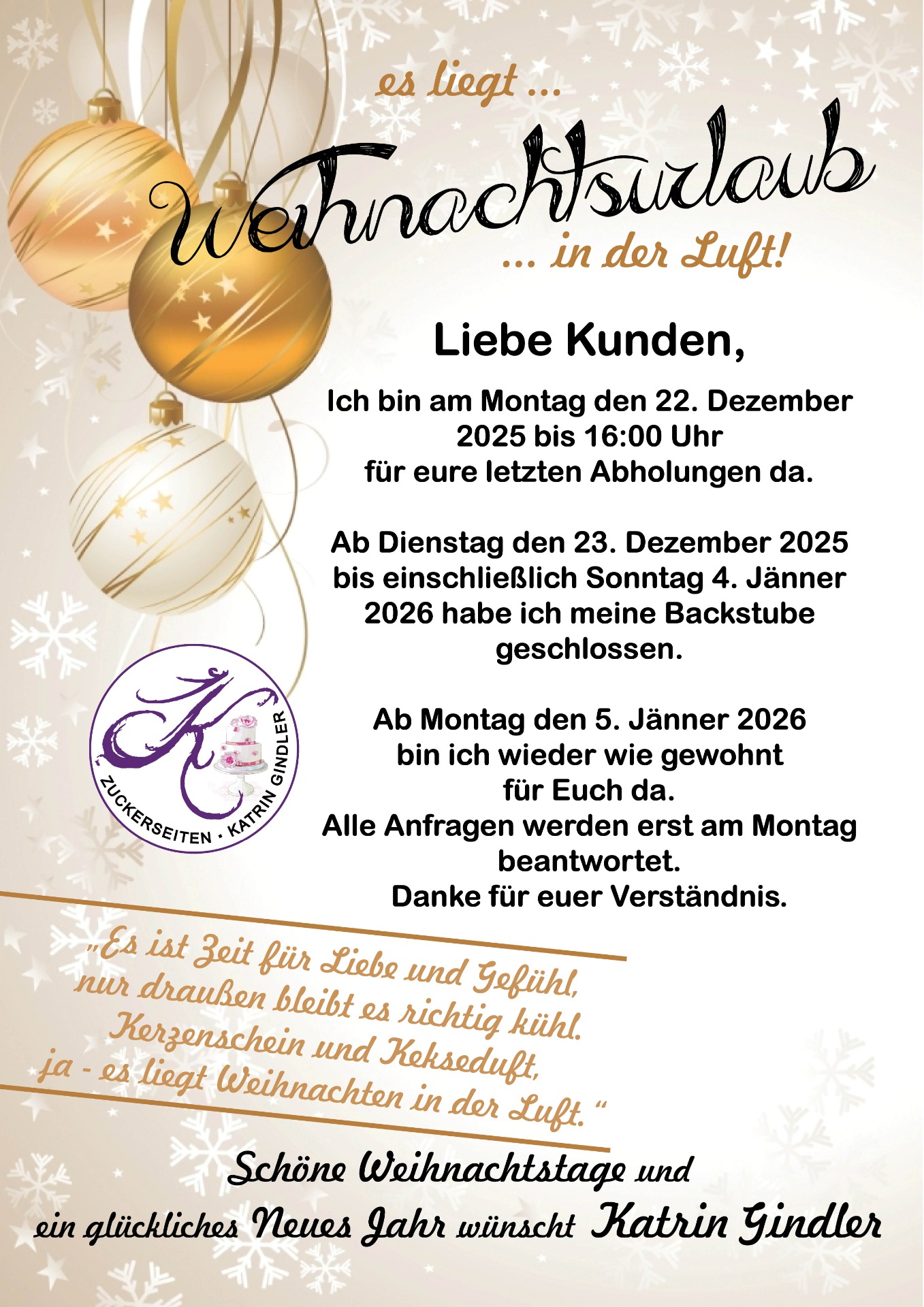 Ab Dienstag den 23. Dezember 2025 bis einschließlich Sonntag 4. Jänner 2026 habe ich meine Backstube geschlossen. Ab Montag den 5. Jänner 2026 bin ich wieder wie gewohnt für Euch da.