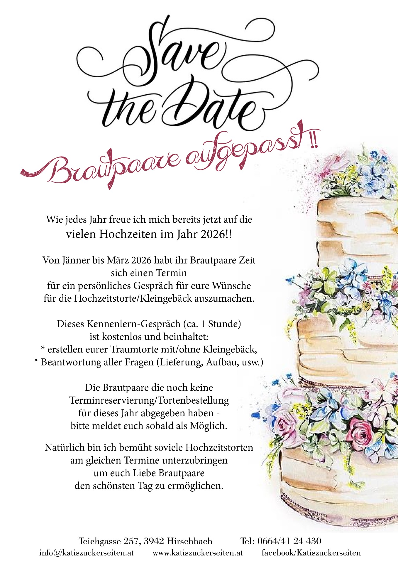Die freien Termine für dieses Jahr werden immer weniger. Wer früh bucht, sichert sich seinen Wunschtermin und eine individuell gestaltete Hochzeitstorte, mit viel Liebe zum Detail und ganz nach euren Vorstellungen.