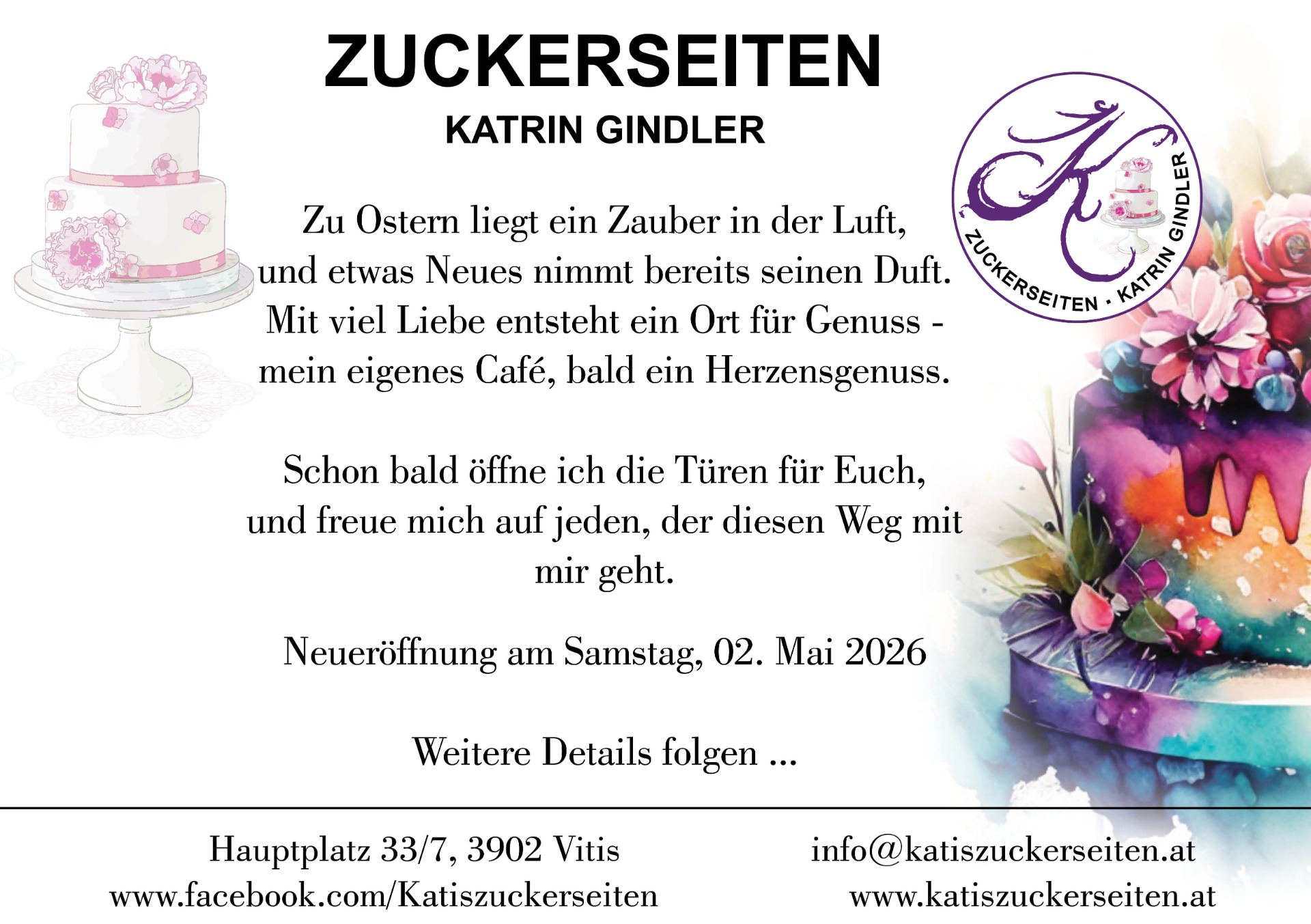 In Vitis, Hauptplatz 33/7, eröffne ich mein eigenes Café mit integrierter Auftragskonditorei.
